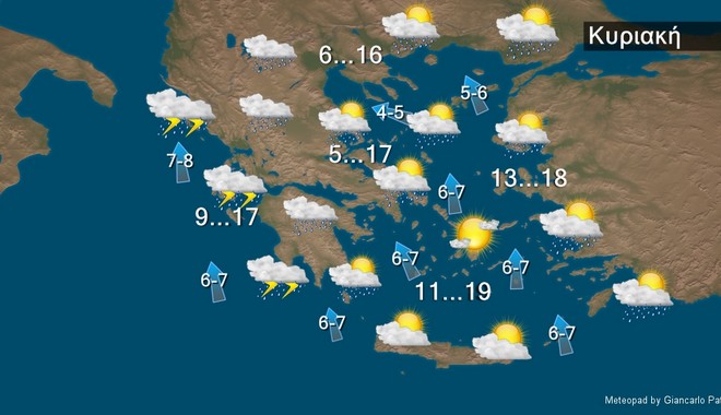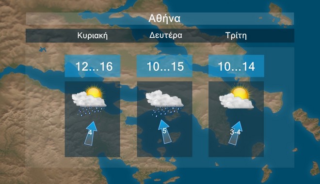 Στην ανατολική Μακεδονία, τη Θράκη, τα νησιά του ανατολικού Αιγαίου και τα Δωδεκάνησα νεφώσεις με τοπικές βροχές, σποραδικές καταιγίδες και σταδιακή βελτίωση. Στην υπόλοιπη χώρα λίγες νεφώσεις, αυξημένες στα δυτικά όπου θα σημειωθούν τοπικές βροχές, βαθμιαία μεμονωμένες καταιγίδες και παροδικές χιονοπτώσεις στα ηπειρωτικά ορεινά. Οι άνεμοι θα πνέουν δυτικοί νοτιοδυτικοί 4 με 5 και πρόσκαιρα στα πελάγη τοπικά 6 μποφόρ. Η θερμοκρασία δεν θα σημειώσει αξιόλογη μεταβολή.