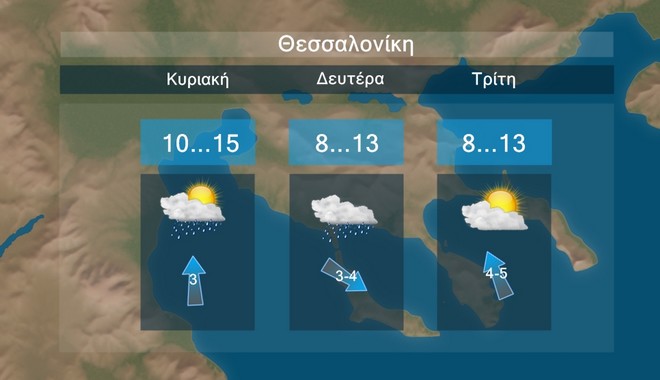 Στη Θεσσαλονίκη προβλέπονται νεφώσεις παροδικά αυξημένες με βροχές Κυριακή και Δευτέρα . Η θερμοκρασία θα κυμαίνεται περί τους 13 με 15 βαθμούς Κελσίου.