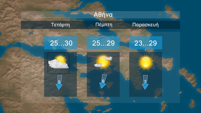 Σχεδόν αίθριος καιρός με λίγες νεφώσεις παροδικά αυξημένες την Τετάρτη στην Αθήνα. Η θερμοκρασία θα έχει μέγιστες τιμές περί τους 29 με 30 βαθμούς Κελσίου.