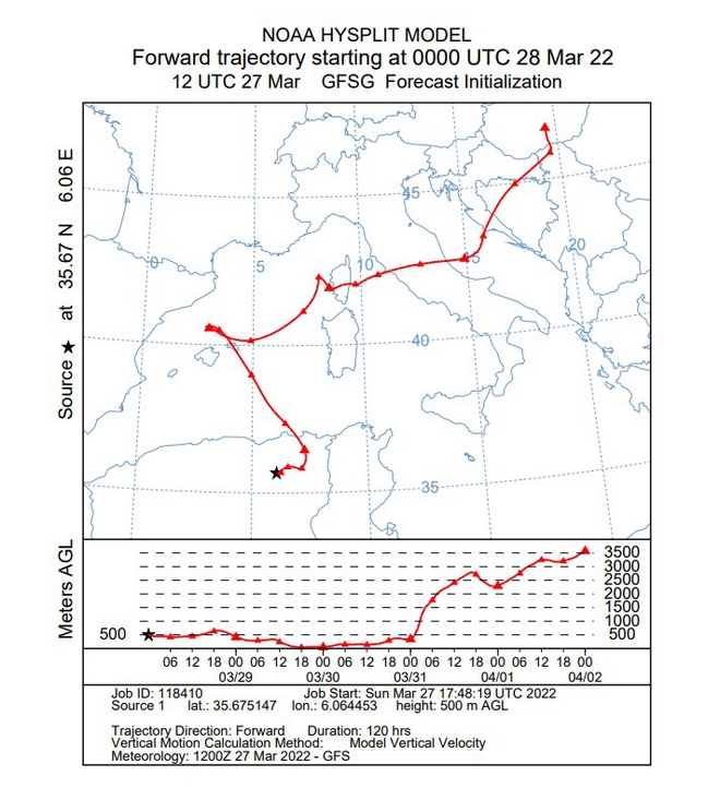 Παραπάνω βλέπουμε την δυνητική πορεία μιας μάζας που ξεκινά το μακρινό της ταξίδι από την Αλγερία προς την Ευρώπη .Η κίνηση της αέριας μάζας και η διάχυση υπολογίζονται στο πλαίσιο της προσέγγισης Lagrange ενώ η μεταφορά και η διάχυση ενός ρύπου υπολογίζονται με την βοήθεια της κατανομής του Gauss και τελικώς παρατηρούμε ότι στο χρονικό διάστημα των 5 ημερών καταλήγει στα Βόρεια Βαλκάνια.