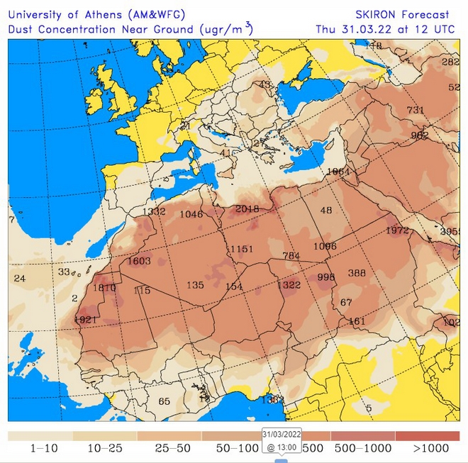 Την ίδια πορεία της σκόνης χωρίς όμως ιδιαίτερες συγκεντρώσεις προβλέπει και το μοντέλο SKIRON του ΕΚΠΑ με την σκόνη να καλύπτει όμως όλη την Βαλκανική.