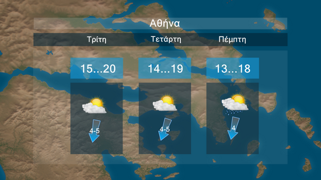 Την Τρίτη στα ανατολικά και νότια προβλέπονται παροδικά αυξημένες νεφώσεις με λίγες βροχές στην Εύβοια, ενώ οι άνεμοι δεν θα ξεπερνούν τα 5 με 6 μπ στα πελάγη. Την Τετάρτη κυρίως από το μεσημέρι και μετά θα ξεκινήσουν βροχές στη Δυτική Ελλάδα που σε τοπικό επίπεδο αργότερα θα επεκταθούν ανατολικότερα. Την Πέμπτη τοπικές βροχές θα έχουμε στα δυτικά τα κεντρικά και τα νότια, όχι όμως σημαντικές. Η θερμοκρασία θα κυμαίνεται σε κανονικά επίπεδα και οι άνεμοι δεν θα ξεπερνούν τα 5 μπ.