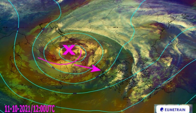 Όπως μπορείτε να διακρίνετε στην σχετική δορυφορική εικόνα του Eumetsat (πρόγραμμα Eumetrain) υπάρχει μια δεύτερη διαταραχή στην Ιταλία η οποία τις επόμενες ώρες θα κινηθεί ανατολικότερα.
