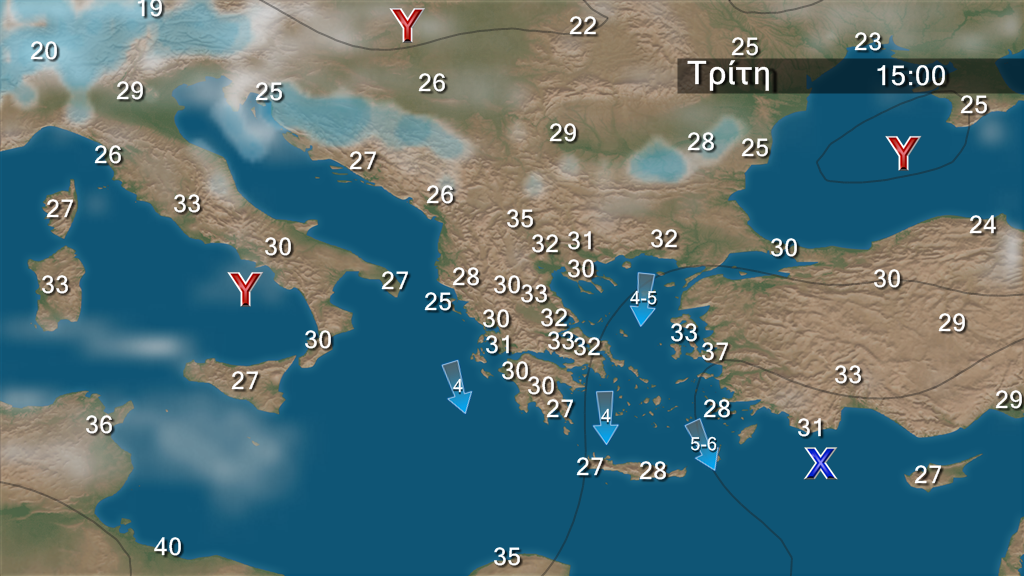 Το επόμενο τριήμερο θα επικρατήσει βελτιωμένος καιρός στο μεγαλύτερο μέρος της χώρας. Η αστάθεια την Τρίτη θα περιοριστεί στα βόρεια ορεινά, ενώ την Τετάρτη και Πέμπτη θα έχουμε τοπικές μπόρες και στα κεντρικά ηπειρωτικά τις μεσημβρινές και πρώτες απογευματινές ώρες. Η θερμοκρασία θα αρχίσει σταδιακά να ανεβαίνει και την Πέμπτη θα φτάσει και τους 35 βαθμούς τοπικά. Στο Αιγαίο θα επικρατήσει βοριαδάκι το πολύ 5-6 μπ στα νότια, λίγο πιο ενισχυμένο την Πέμπτη.