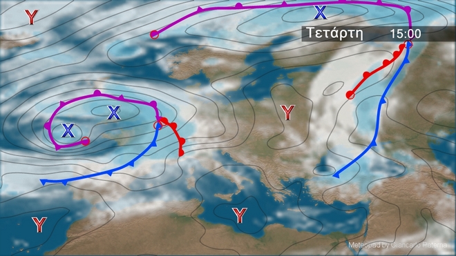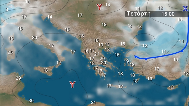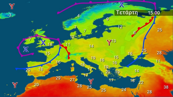 Στον γενικό χάρτη της Ευρώπης φαίνεται χαρακτηριστικά το ψυχρό μέτωπο που ήδη απομακρύνεται ανατολικότερα ενώ προς την περιοχή μας επεκτείνεται το πεδίο υψηλών πιέσεων της κεντρικής Μεσογείου. Οι θερμοκρασίες σε όλη την ηπειρωτική Ευρώπη κυμαίνονται σε επίπεδα κάτω από τα κανονικά.