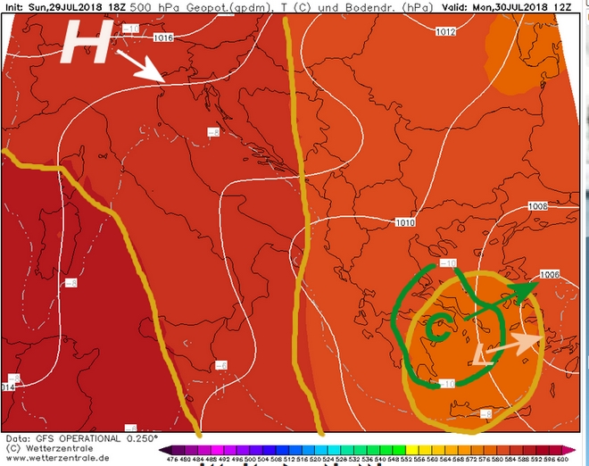 Στον παραπάνω χάρτη της ανώτερης ατμόσφαιρας των 500 hPa παρατηρούμε ότι υπάρχει ένα ανώτερο χαμηλό (L), το οποίο συνοδεύεται με ψυχρές αέριες μάζες (C) της τάξεως των -10 με -11 βαθμών Κελσίου. Στην κατώτερη στάθμη των 850 hPa οι αέριες μάζες έχουν θερμοκρασίες περί τους 17 βαθμούς και πληρούνται οι συνθήκες εκδήλωσης αστάθειας. Το στοιχείο που έκανε όμως αυτές τις βροχοπτώσεις τόσο έντονες δεν ήταν τόσο η θερμοκρασιακή διαφορά, αλλά ο ισχυρός στροβιλισμός και οι έντονες ανοδικές κινήσεις αλλά η περαιτέρω ανάλυση ξεφεύγει από τον σκοπό του άρθρου. Παρακάτω θα δούμε γιατί είχε δίκιο ο καπετάνιος και γιατί του έμοιαζε ο καιρός ίδιος με τους τροπικούς αλλά και γιατί αυτό συνέβαινε και συμβαίνει επειδή δεν έχει μελτέμια.