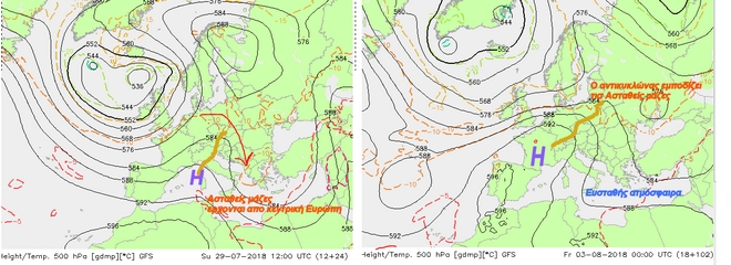 Στον δεύτερο χάρτη δεξιά παρατηρούμε ότι αυτό γίνεται την ερχόμενη Παρασκευή όπου ενισχύεται ο αντικυκλώνας (Η) στη Γαλλία και εκτείνεται μέχρι τα Βόρεια Βαλκάνια. Αυτή η έξαρση θα εμποδίσει τις ψυχρές μάζες να κινηθούν και θα τις μπλοκάρει οπότε ο καιρός θα γίνει ευσταθής και θα επικρατήσει διάταξη μελτεμιού. Με την εισβολή του μελτεμιού δεν αποκλείονται κάποια πρόσκαιρα φαινόμενα στα ανατολικά και νότια, αλλά θα είναι μικρής έντασης.