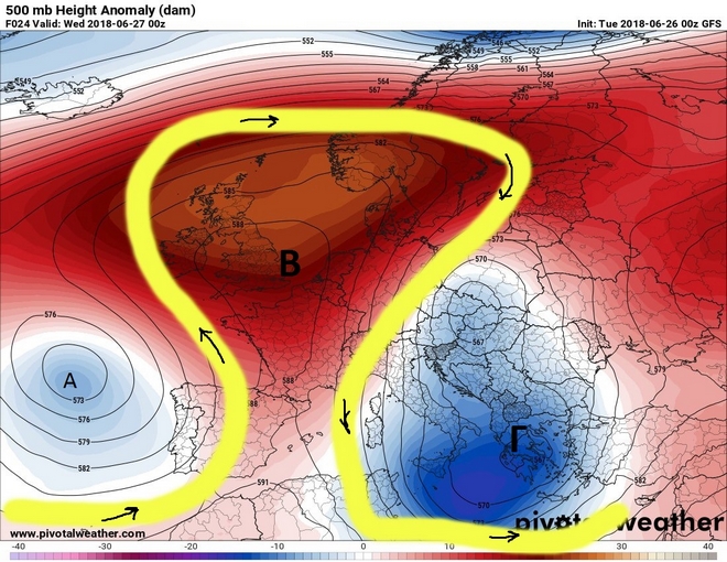 Συνήθως εμφανίζουν ένα μοτίβο ύφεση-υψηλό-ύφεση (κυκλώνας-αντικυκλώνας-κυκλώνας), διατεταγμένο από τα δυτικά προς τα ανατολικά. Στον παραπάνω χάρτη παρατηρούμε μια ύφεση δυτικά της Ιβηρικής χερσονήσου (περιοχή Α) , αντικυκλώνα στη Βόρεια Ευρώπη (περιοχή Β) και ύφεση στα νοτιοανατολικά (περιοχή Γ) η οποία μάλιστα συνοδεύεται και από πολύ χαμηλές θερμοκρασίες. Αντίθετα στη Βόρεια Ευρώπη έχουμε υψηλές τιμές με μεγάλες αποκλίσεις των θερμοκρασιών και τον υδράργυρο να κυμαίνεται σε πολύ υψηλά επίπεδα για την εποχή. Η διάταξη των συστημάτων στην ανώτερη ατμόσφαιρα “πηδαλιουχεί” τα επιφανειακά συστήμτα και για τον λόγο αυτό έχουμε διατήρηση αυτής της καιρικής κατάστασης για μεγάλο χρονικό διάστημα . Το αίτιο που δημιουργεί αυτά τα μπλοκαρίσματα μπορεί να οφείλεται σε πολλούς λόγους , όπως για παράδειγμα λόγω στρατοσφαιρικής θέρμανσης, κατάρρευσης του πολικού στροβίλου κ.α. που ξεφεύγει από το αντικείμενο του σημερινού άρθρου. Ανάλογη κατάσταση είχαμε στις αρχές Ιουνίου του 1994 , όπου τότε είχε επικρατήσει ένας ιδιαίτερα κρύος καιρός με χιόνια στην περιοχή της Φλώρινας στις 7 Ιουνίου του 1994 . Μικρότερης κλίμακας ανάλογες ψυχρές εισβολές σημειώθηκαν από 30 Ιουνίου εως και 4 Ιουλίου 1991.