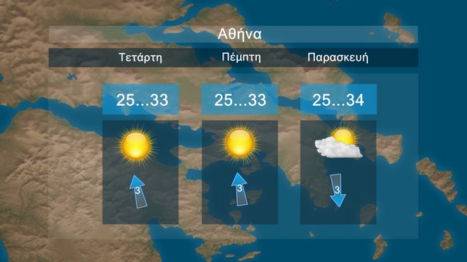 Στην Αθήνα προβλέπεται σχεδόν αίθριος καιρός με τοπικές νεφώσεις παροδικά αυξημένες την Παρασκευή. Η θερμοκρασία θα κυμαίνεται περί τους 33 με 34 βαθμούς Κελσίου.
