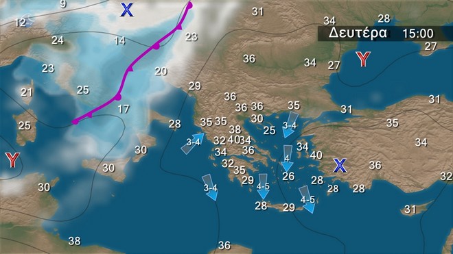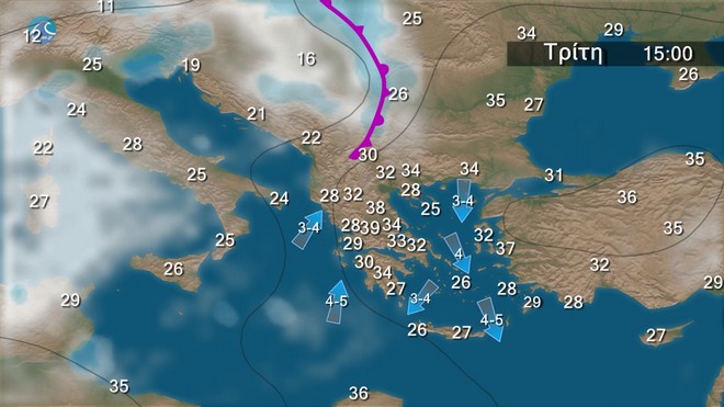 Αίθριος καιρός. Οι άνεμοι στα δυτικά θα είναι μεταβλητοί ασθενείς και το απόγευμα στο Ιόνιο δυτικοί βορειοδυτικοί 4 μποφόρ. Στα ανατολικά θα πνέουν από βόρειες διευθύνσεις 3 με 5 και στο βόρειο Αιγαίο πρόσκαιρα τοπικά 6 μποφόρ. Η θερμοκρασία θα σημειώσει μικρή περαιτέρω άνοδο και θα φτάσει στα ηπειρωτικά κατά τόπους τους 37 με 38 βαθμούς Κελσίου.