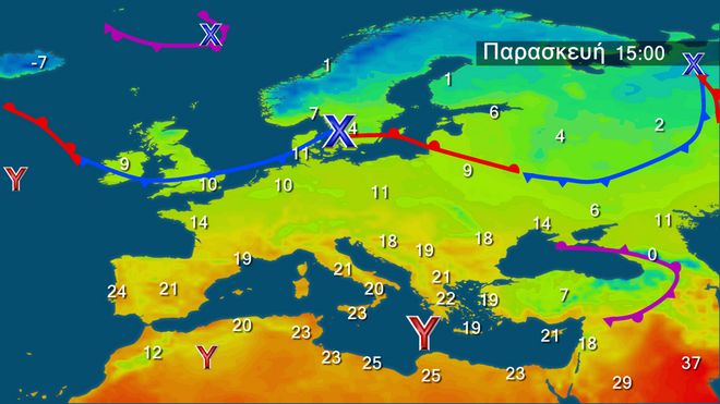 H Παρασκευή θα είναι μια μέρα ηλιόλουστη αλλά το μπουφάν θα είναι απαραίτητο, διότι και πάλι το πρωί η ψύχρα (για τη Βόρεια Ελλάδα κρύο) θα είναι αισθητή. Στην Ευρώπη παρατηρούμε στους χάρτες που ακολουθούν ότι στην περιοχή μας εγκαθίστ6αται ένα πεδίο υψηλών πιέσεων και αυτό πρακτικά σημαίνει ότι δεν προβλέπονται σημαντικές βροχές τουλάχιστον για το επόμενο πενθήμερο.