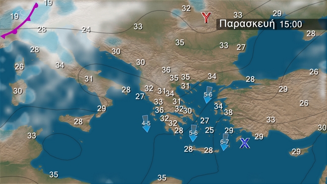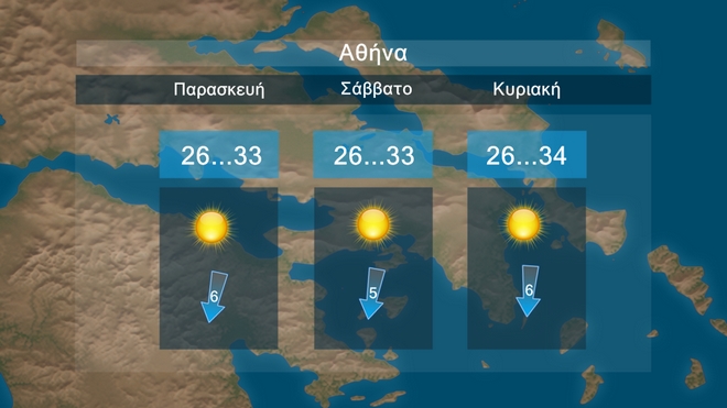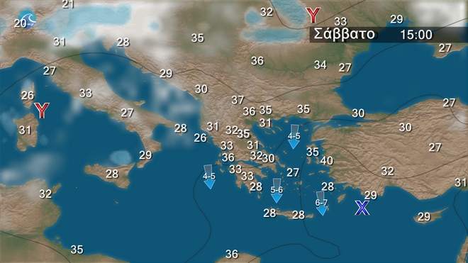 Γενικά αίθριος καιρός. Τις μεσημβρινές και απογευματινές ώρες θα αναπτυχθούν τοπικές νεφώσεις στα δυτικά και βόρεια ηπειρωτικά και είναι πιθανό να εκδηλωθούν τοπικοί όμβροι στα βορειοδυτικά ορεινά. Οι άνεμοι θα πνέουν από βόρειες διευθύνσεις στα δυτικά 3 με 5, στα ανατολικά 5 με 6 και στο Αιγαίο κατά τη διάρκεια της ημέρας τοπικά 7 μποφόρ. Η θερμοκρασία δεν θα σημειώσει αξιόλογη μεταβολή.