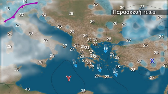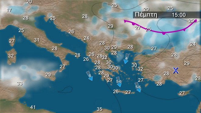 Την Πέμπτη θα εκδηλωθούν βροχές και καταιγίδες στην ανατολική Θεσσαλία, Β. Σποράδες, ανατολική Στερεά και Εύβοια αλλά βαθμιαία ο καιρός θα βελτιωθεί. Οι άνεμοι θα φτάνουν και τα 6 μποφόρ και η θερμοκρασία θα πέσει ακόμη λίγο.