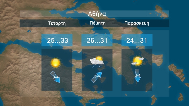 Στην Αττική προβλέπεται  αίθριος καιρός. Οι άνεμοι θα πνέουν Βόρειοι Βορειοδυτικοί 4 με 5 μποφόρ.  Η θερμοκρασία θα κυμανθεί από 22 έως 36 βαθμούς Κελσίου.