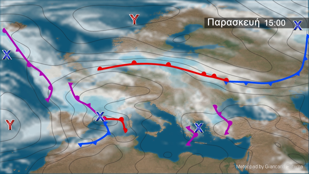 Στον χάρτη της Βαλκανικής παρατηρούμε ότι στη κεντρική Μεσόγειο υπάρχει ένα αβαθές χαμηλό , το οποίο θα κινηθεί ανατολικά και θα μας επηρεάσει την Παρασκευή όπου στο Ιόνιο και τα ηπειρωτικά προβλέπονται νεφώσεις παροδικά αυξημένες με τοπικές βροχές και σποραδικές καταιγίδες που μέχρι το απόγευμα πιθανόν στα ηπειρωτικά να είναι τοπικά ισχυρές.