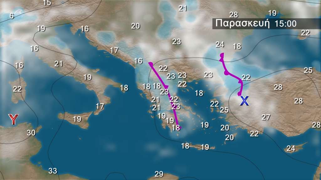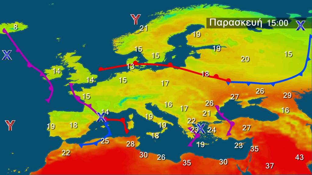 Στον γενικό χάρτη της Ευρώπης διακρίνονται τα χαμηλά στα ανατολικά της Ευρώπης που προκαλούν άστατο καιρό ενώ αντίθετα στα βόρεια επικρατούν υψηλές πιέσεις και γενικά αίθριος καιρός. Οι πολύ υψηλές θερμοκρασίες που επικρατούσαν στην Ιβηρική το προηγούμενο διήμερο, θα αρχίσουν να υποχωρούν.