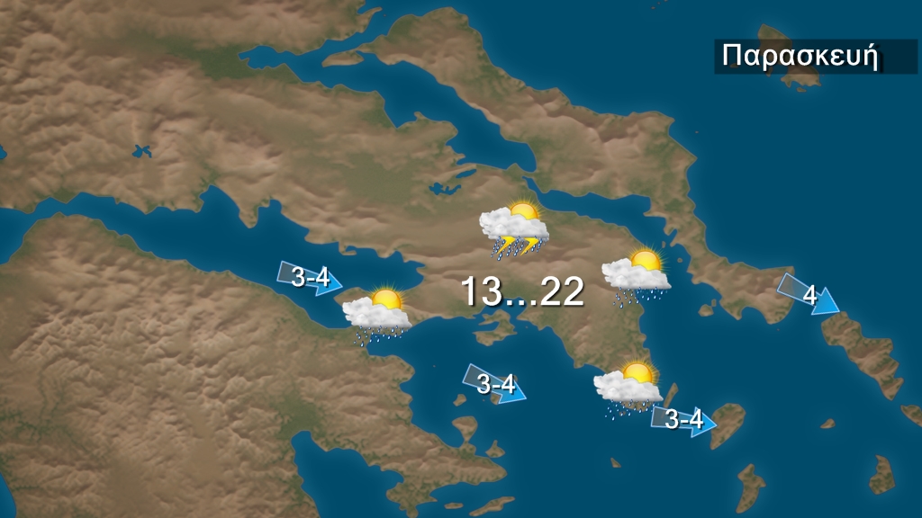 Στις υπόλοιπες περιοχές δυτικοί νοτιοδυτικοί 4 με 5 μποφόρ. Η θερμοκρασία θα πέσει λίγο και θα φτάσει στα βόρεια τους 19 με 23 βαθμούς, στα υπόλοιπα ηπειρωτικά και το Ιόνιο τους 21 με 24 βαθμούς και στα νησιά του Αιγαίου τους 22 με 25 βαθμούς.
