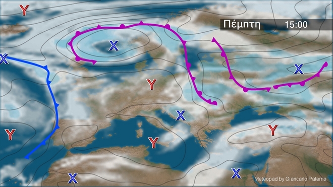 Στον γενικό χάρτη της Ευρώπης διακρίνονται το ισχυρό χαμηλό στη Βόρεια Ευρώπη που προκαλεί άστατο καιρό ενώ στα νότια υπάρχουν υψηλές πιέσεις , αλλά το χαμηλό και ο υποτροπικός αεροχείμαρρος που βρίσκονται στις ακτές της Αφρικής προκαλούν αραιή συννεφιά.