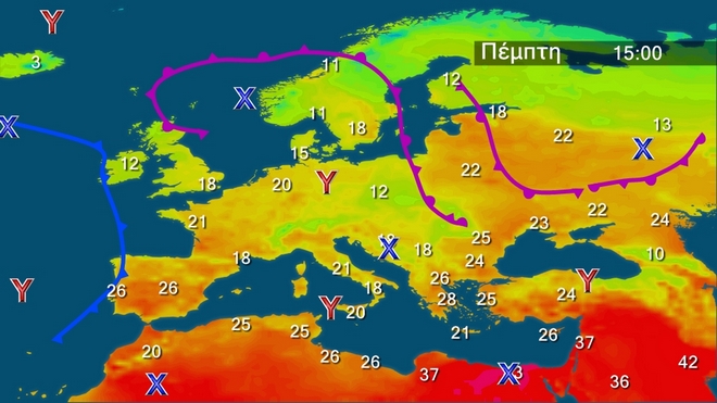 Στον χάρτη της Βαλκανικής διακρίνεται καλύτερα το ομαλό πεδίο πάνω από τη χώρα μας. Έτσι την Πέμπτη στη κεντρική και νότια χώρα προβλέπονται αραιές νεφώσεις κατά τόπους πιο πυκνές με ασθενείς τοπικές βροχές και σταδιακή βελτίωση από το μεσημέρι. Στην υπόλοιπη χώρα αρχικά αίθριος βαθμιαία όμως θα αναπτυχθούν νεφώσεις και από τις απογευματινές ώρες στα κεντρικά και βόρεια ηπειρωτικά θα εκδηλωθούν τοπικοί όμβροι και σποραδικές καταιγίδες. Οι άνεμοι θα πνέουν στα δυτικά δυτικοί βορειοδυτικοί 3 με 5 μποφόρ και στα ανατολικά από ανατολικές διευθύνσεις με την ίδια ένταση Η θερμοκρασία δε θα σημειώσει αξιόλογη μεταβολή και  θα φτάσει στα βόρεια τους 26 με 28 βαθμούς , στα υπόλοιπα ηπειρωτικά και το Ιόνιο τους 28 με 30 βαθμούς και στα νησιά του Αιγαίου τους 27 με 29 βαθμούς και στη Κρήτη τοπικά 32.