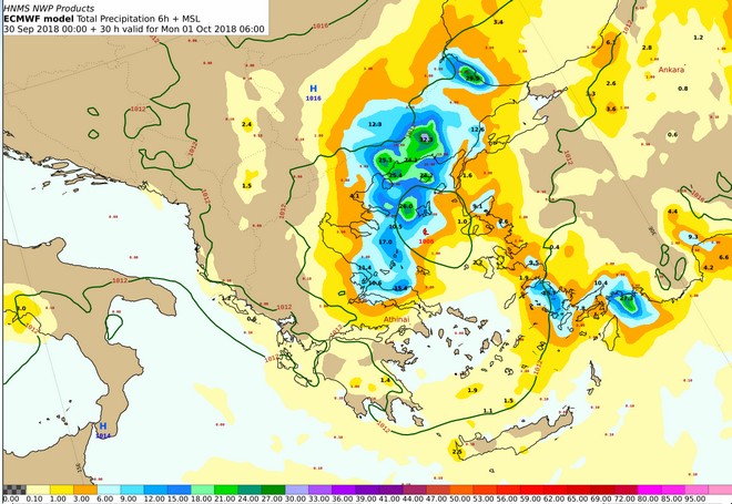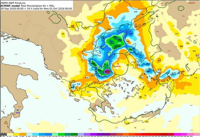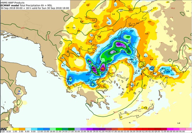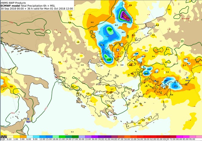 Τα μεγαλύτερα ύψη βροχής από το μεσημέρι της Κυριακής και για το επόμενο 6ωρο αποτυπώνονται στον χάρτη που ακολουθεί. Οι περιοχές που θα επηρεαστούν περισσότερο είναι η Ανατολική Στερεά η Εύβοια (κυρίως η Κεντρική και η Βόρεια), τα ανατολικά τμήματα της Θεσσαλίας, καθώς επίσης και οι νησιωτικές περιοχές των Βορείων Σποράδων και του υπόλοιπου Βόρειου και Ανατολικού Αιγαίου.