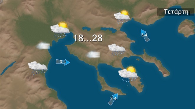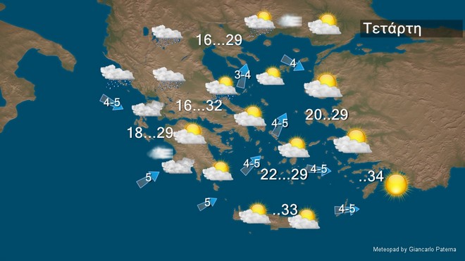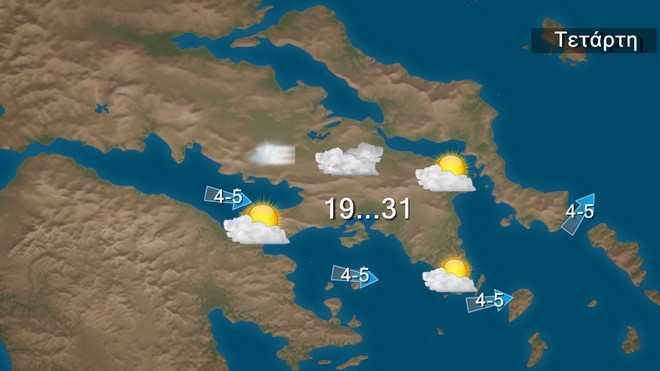Την Τετάρτη στα δυτικά, τα κεντρικά και τα βόρεια προβλέπεται αυξημένη συννεφιά και θα σημειωθούν τοπικές βροχές. Το βράδυ στα βορειοδυτικά θα εκδηλωθούν σποραδικές καταιγίδες. Στις υπόλοιπες περιοχές θα υπάρχουν αραιές νεφώσεις κατά διαστήματα. Οι συγκεντρώσεις αφρικανικής σκόνης στην ατμόσφαιρα βαθμιαία θα μειωθούν και θα περιοριστούν στα νότια. Οι άνεμοι θα πνέουν από δυτικές διευθύνσεις 3 με 5 μποφόρ. Η θερμοκρασία θα σημειώσει μικρή πτώση σε όλη τη χώρα και θα έχει μέγιστη τιμή στα βόρεια τους 29 βαθμούς, στα υπόλοιπα ηπειρωτικά και το Ιόνιο τους 29 με 32 βαθμούς Κελσίου, στις Κυκλάδες τους 29 στην Κρήτη τους 33 βαθμούς και στο Ανατολικό Αιγαίο και τα Δωδεκάνησα τους 29 με 33 βαθμούς Κελσίου.