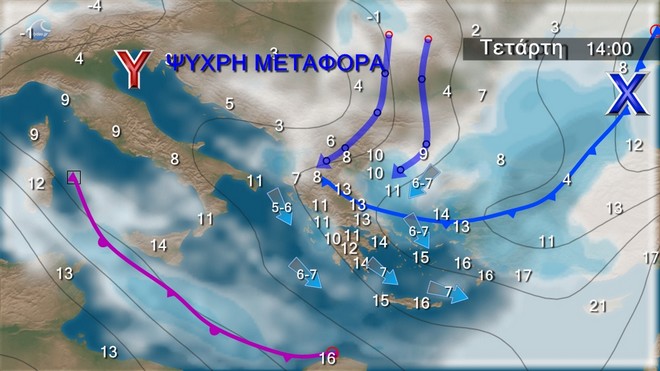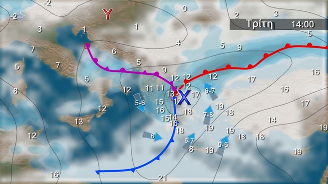 Στα δυτικά, τα κεντρικά, τα βόρεια, τα νησιά του ανατολικού Αιγαίου και βαθμιαία και στις υπόλοιπες περιοχές προβλέπονται νεφώσεις με βροχές και σποραδικές καταιγίδες. Παροδικές χιονοπτώσεις θα σημειωθούν στα βορειοδυτικά ορεινά. Ευνοείται η μεταφορά σκόνης κυρίως στα νοτιοανατολικά. Οι άνεμοι θα πνέουν από νότιες διευθύνσεις 4 με 6 και στο Αιγαίο 7 με 8 μποφόρ, στρεφόμενοι βαθμιαία στα δυτικά σε δυτικών διευθύνσεων 5 με