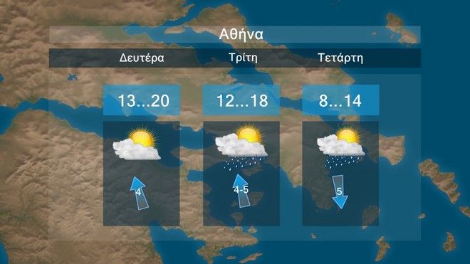 Στην Αθήνα προβλέπονται τοπικές νεφώσεις παροδικά αυξημένες με βροχή την Τρίτη και Τετάρτη. Η μέγιστη θερμοκρασία από 20 βαθμούς της Δευτέρας την Τετάρτη θα πέσει στους 14 βαθμούς Κελσίου.