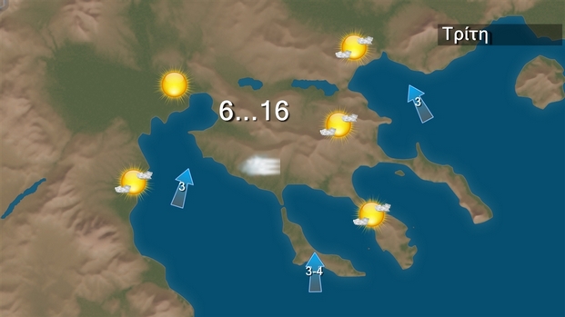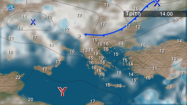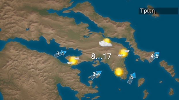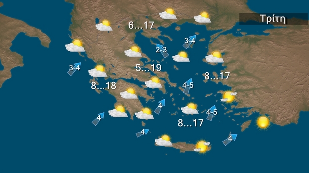 Η θερμοκρασία: θα φτάσει στα βόρεια το μεσημέρι τους 17 βαθμούς στα δυτικά τους 18 στα υπόλοιπα ηπειρωτικά τους 19 βαθμούς και στα νησιά του Αιγαίου τους 17 βαθμούς Κελσίου.