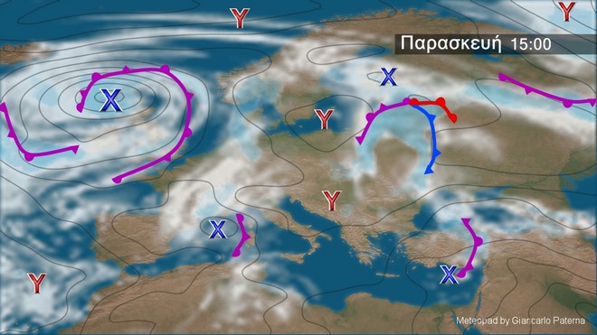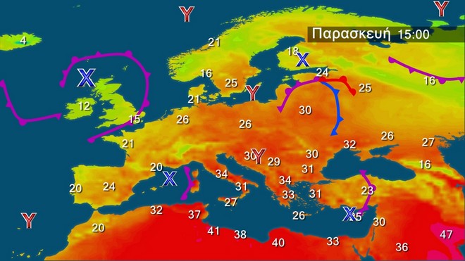 Στον γενικό χάρτη της Ευρώπης διακρίνονται τα βαρομετρικά χαμηλά που επηρεάζουν τη δυτική και βόρεια Ευρώπη. Ιδιαίτερα ζεστός παραμένει ο καιρός στην ανατολική Ευρώπη, τα Βαλκάνια και τη χώρα μας.