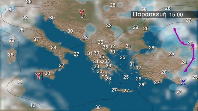 Περιορισμένη αστάθεια στα ηπειρωτικά την Παρασκευή και υψηλές θερμοκρασίες τοπικά στους 37 με 38 βαθμούς στα ηπειρωτικά. Οι άνεμοι θα πνέουν από βόρειες διευθύνσεις 3 με 5 και πρόσκαιρα στο Αιγαίο 6 μποφόρ. Την Πέμπτη σημειώθηκαν 37 βαθμοί Κελσίου στο Αγρίνιο και τα Τρίκαλα της Θεσσαλίας.