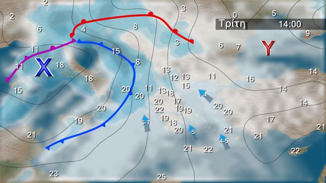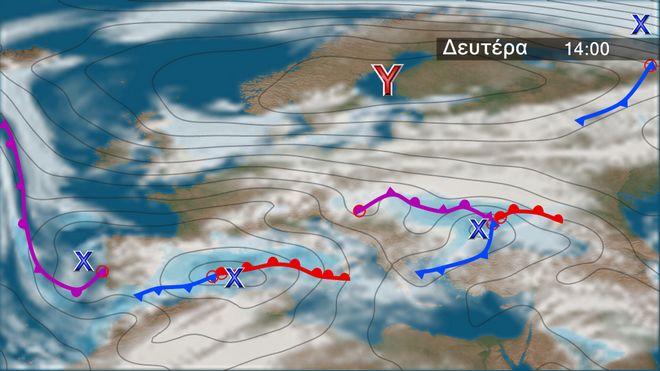 Στον χάρτη των βαρομετρικών συστημάτων της Ευρώπης παρατηρούμε ότι το σύστημα που επηρέασε έχει πλέον κινηθεί βορειοανατολικά, ενώ ένα άλλο χαμηλό που βρίσκεται στη Δυτική Μεσόγειο μέσα στο επόμενο διήμερο θα κινηθεί ανατολικά και θα επηρεάσει κυρίως τα δυτικά κεντρικά και βόρεια τμήματα της χώρας μας.