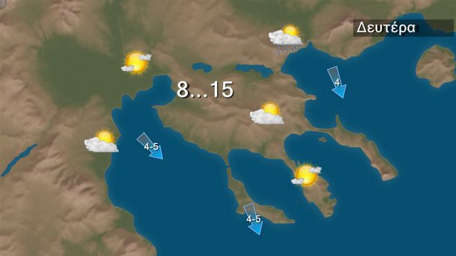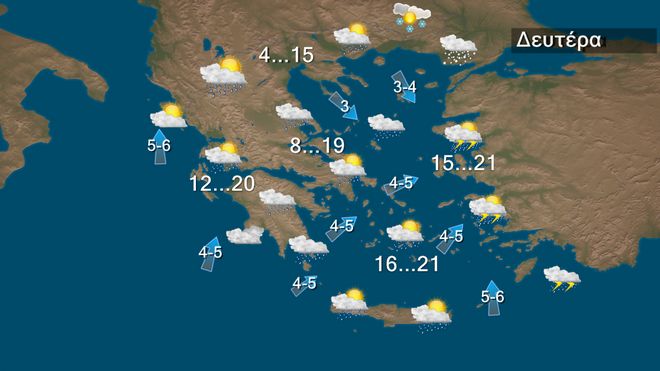 Για τη Δευτέρα βροχές και καταιγίδες θα έχουμε στην αρχή της ημέρας στα ανατολικά και βόρεια και χιόνια στα ορεινά . Στην υπόλοιπη χώρα θα υπάρχουν παροδικές νεφώσεις με λίγα φαινόμενα . Οι άνεμοι δεν θα ξεπερνούν τα 5 με 6 μπ και η θερμοκρασία θα φτάσει τοπικά στα νότια και τα ανατολικά τους 21 βαθμούς Κελσίου.