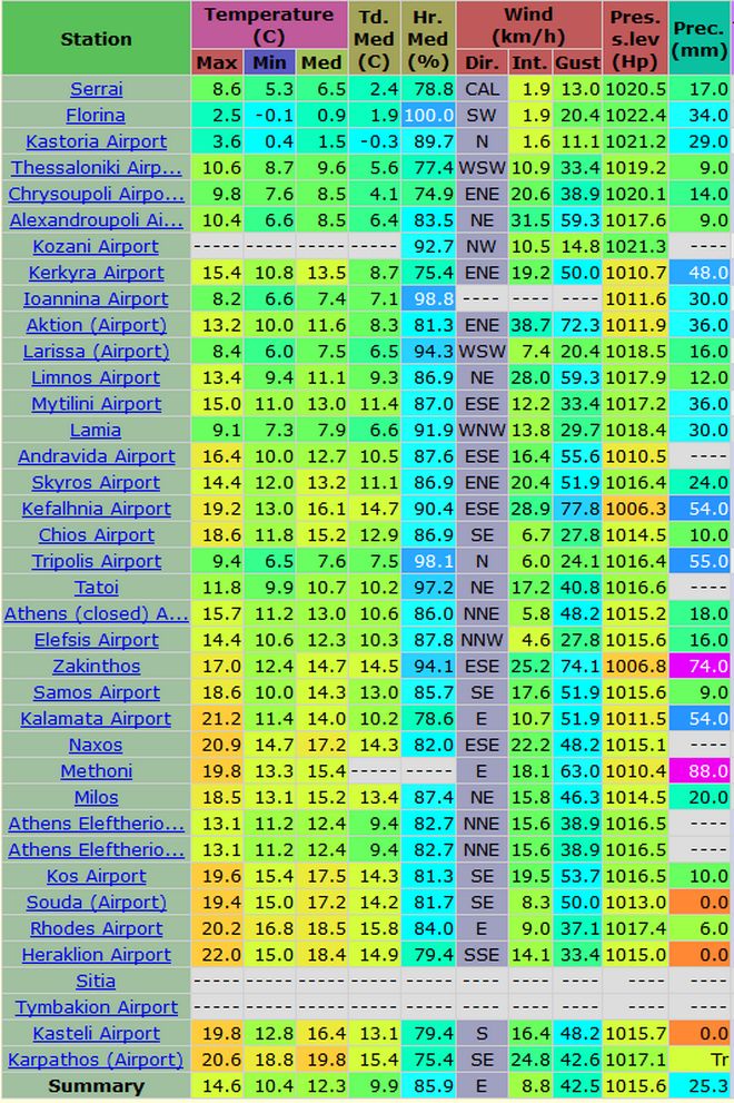 Ιδιαίτερα βροχερός ήταν την Κυριακή ο καιρός στη Δυτική κυρίως Ελλάδα και στη Μεθώνη σημειώθηκαν 88mm βροχής και στη Ζάκυνθο 74 . Άξιο λόγου αλλά όχι σπάνιο τέτοια εποχή ήταν η μεγάλη θερμοκρασιακή διαφορά μεταξύ βορρά και νότου. Στον πίνακα που ακολουθεί μπορείτε να δείτε ότι όταν στο Ηράκλειο της Κρήτης, στη Νάξο, την Κάρπαθο και τη Ρόδο η θερμοκρασία ήταν 20 με 22 βαθμούς με νοτιά στη Φλώρινα και την Καστοριά δεν ξεπερνούσε ο υδράργυρος τους 2 με 4 βαθιούς