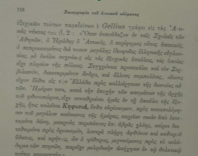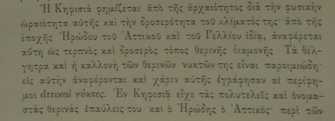 Εκεί μνημονεύεται ότι ο Ηρώδης ο Αττικός έφευγε από το κέντρο της Αθήνας και πήγαινε στην Κηφισιά για να αποφεύγει τα «καύματα» του Αυγούστου και του Σεπτεμβρίου.