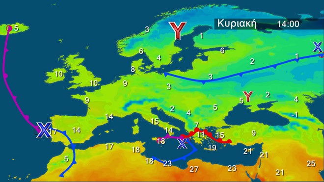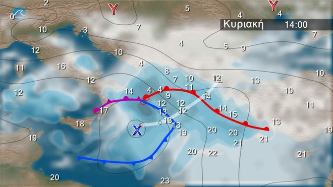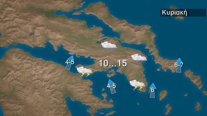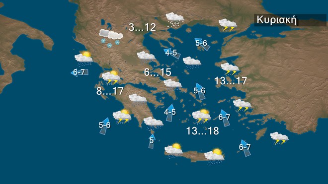 Με ισχυρές βροχές και καταιγίδες θα κυλήσει ο καιρός την Κυριακή στα δυτικά, τα κεντρικά, τα βόρεια και αργότερα στο ανατολικό Αιγαίο. Το βαρομετρικό χαμηλό που από το Σάββατο επηρεάζει τη χώρα μας θα κινηθεί ανατολικά βορειοανατολικά και θα επηρεάσει όλη τη χώρα. Λόγω του θερμού μετώπου που συνοδεύει αυτή τη διαταραχή η θερμοκρασία θα ανέβει λίγο κυρίως στις νοτιότερες περιοχές.