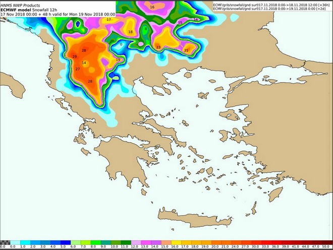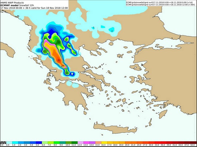 Από πλευράς φαινομένων θα εκδηλωθούν και χιονοπτώσεις αλλά πλέον σε μεγαλύτερα υψόμετρα και συγκεκριμένα από τα 1000 με 1200 μέτρα και πάνω στη Βόρεια Ελλάδα και από τα 1500 με 1800 μέτρα στις κεντρικές περιοχές. Στους χάρτες που ακολουθούν απεικονίζονται τα ύψη χιονιού (σε cm) από το πρωί μέχρι το μεσημέρι στον πρώτο και από το μεσημέρι έως το βράδυ στον δεύτερο. Όπως παρατηρείτε εντείνονται οι χιονοπτώσεις από το μεσημέρι και μετά αλλά σε μεγαλύτερα υψόμετρα.