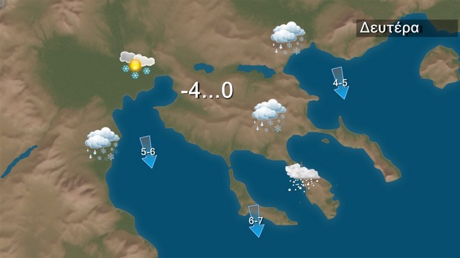 Στον χάρτη της Βαλκανικής που ακολουθεί διακρίνονται και οι δύο διαταραχές. Μας ενδιαφέρει αυτή που έρχεται από τα βόρεια Βαλκάνια που θα κινηθεί νοτιότερα και από το βράδυ θα προκαλέσει μεταβολή του καιρού σε όλη τη χώρα. Οι χιονοπτώσεις θα επηρεάσουν κυρίως μια «ζώνη» που θα ξεκινά από τη Χαλκιδική και θα φτάνει μέχρι τα βορειοανατολικά τμήματα της Αττικής αρχικά και αργότερα θα επηρεαστούν και οι νοτιότερες περιοχές. Οι άνεμοι θα πνέουν βόρειοι 6 με 7 και τοπικά 8 μπ. Η θερμοκρασία θα φτάσει στα βόρεια το πολύ τον 1 βαθμό, στα υπόλοιπα ηπειρωτικά τους 8 και στα νησιά του Αιγαίου τους 9 βαθμούς Κελσίου.