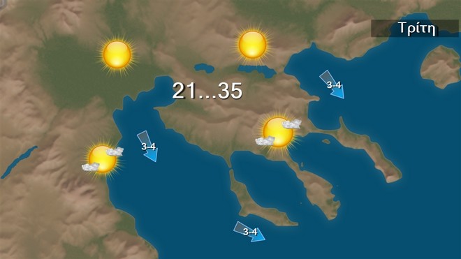 Τη Τρίτη προβλέπεται γενικά αίθριος καιρός με πρόσκαιρες νεφώσεις το μεσημέρι στα ηπειρωτικά και κυρίως στα ορεινά. Οι άνεμοι θα πνέουν από βόρειες διευθύνσεις 3 με 5, στο Αιγαίο 5 με 6 και στα νότια τμήματά του τοπικά 7 μποφόρ. Η θερμοκρασία θα σημειώσει μικρή άνοδο. Θα φθάσει στα βόρεια και στη νησιωτική χώρα τους 34 με 35 και στα υπόλοιπα ηπειρωτικά τους 36 και τοπικά τους 37 με 38 βαθμούς Κελσίου.