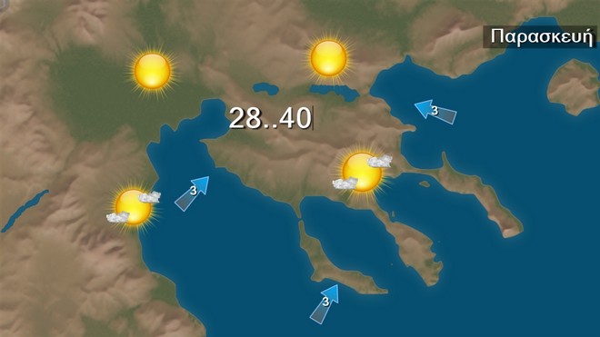 Την Παρασκευή προβλέπεται γενικά αίθριος και ζεστός καιρός. Λίγες πρόσκαιρες νεφώσεις θα υπάρχουν τις μεσημβρινές και απογευματινές ώρες στα κεντρικά και βόρεια ηπειρωτικά ορεινά. Οι άνεμοι θα πνέουν από βόρειες διευθύνσεις 3 με 4, στα πελάγη τοπικά 5 και στο Αιγαίο 6 μποφόρ. Οι υψηλές θερμοκρασίες θα κορυφωθούν.