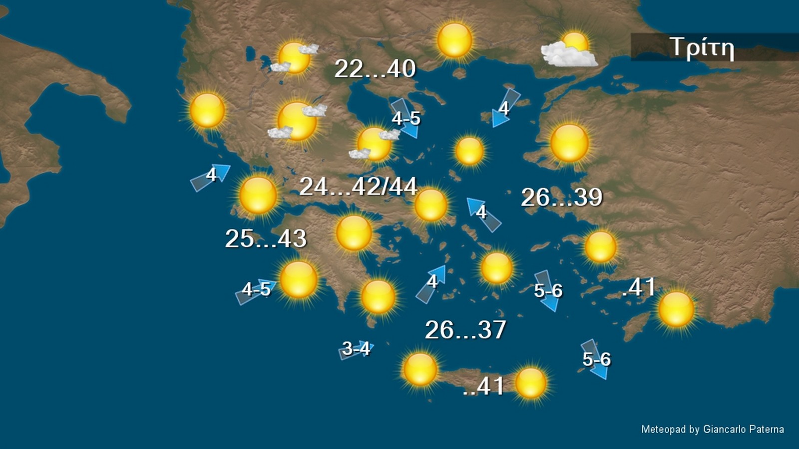 Η θερμοκρασία θα σημειώσει άνοδο και οι μέγιστες τιμές θα φτάσουν στα ηπειρωτικά τους 40 με 42, στο εσωτερικό της Θεσσαλίας και της Στερεάς τους 43 με 44, στα νησιά του Ιονίου τους τα Δωδεκάνησα και τη νότια Κρήτη τους 39 με 41 και στην υπόλοιπη νησιωτική χώρα τους 36 με 38 βαθμούς Κελσίου.