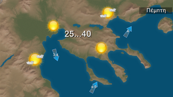 Για σήμερα Πέμπτη σε όλη τη χώρα προβλέπεται γενικά αίθριος καιρός. Τοπικές νεφώσεις θα αναπτυχθούν στα κεντρικά και βόρεια ηπειρωτικά και το βόρειο Ιόνιο από νωρίς το απόγευμα και είναι πιθανό να σημειωθούν τοπικοί όμβροι στα ηπειρωτικά ορεινά. Οι άνεμοι στα βόρεια θα πνέουν μεταβλητοί 3 με 4 μποφόρ στρεφόμενοι γρήγορα σε νότιους νοτιοδυτικούς έως 5 μποφόρ. Στα κεντρικά και νότια θα πνέουν δυτικοί βορειοδυτικοί 3 με 5 και τοπικά έως 6 μποφόρ. Η θερμοκρασία θα παραμείνει σε υψηλά επίπεδα και πιο συγκεκριμένα θα φτάσει στα βόρεια ηπειρωτικά τους 39 με 42 βαθμούς στα κεντρικά και νότια ηπειρωτικά τους 43 και κατά τόπους τους 44 με 45 βαθμούς και στις νησιωτικές περιοχές τους 38 με 41 βαθμούς Κελσίου. Οι ελάχιστες θερμοκρασίες θα διατηρηθούν σε αρκετές περιοχές της κεντρικής και νότιας ηπειρωτικής χώρας και στα νησιά πάνω από 27 βαθμούς Κελσίου, εντείνοντας το αίσθημα δυσφορίας.