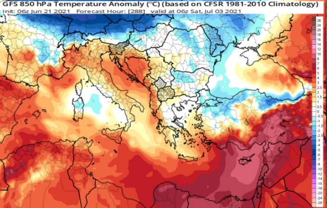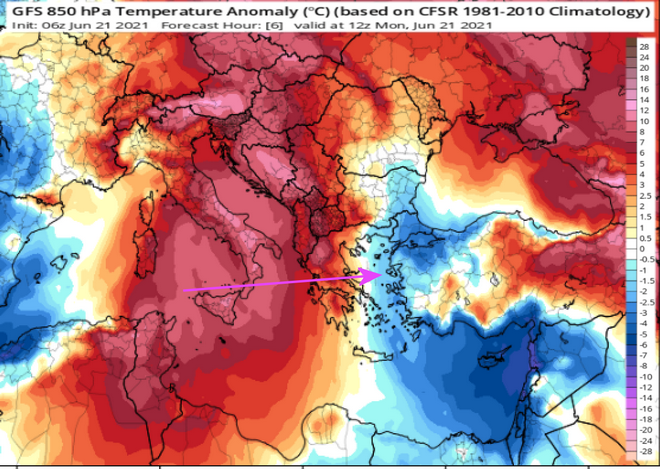 Στον παραπάνω χάρτη διακρίνονται οι πολύ θερμές αέριες μάζες που σήμερα βρίσκονται στη Κεντρική Μεσόγειο με τιμές κατά 8 με 10 βαθμούς πάνω από τη μέση κλιματική τιμή που έχουν την τάση να κινηθούν ανατολικότερα και να μας επηρεάσουν .Στον χάρτη διακρίνονται με μπλε χρωματισμό οι δροσερές μάζες στο Ανατολικό Αιγαίο τις Ανατολικές Κυκλάδες και τα Δωδεκάνησα