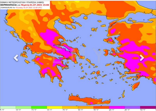 Για μια γρήγορη ματιά για να καταλάβετε με γραφιστικό τρόπο ποιες περιοχές θα έχουν πάνω από 40 βαθμούς Κελσίου σας παραθέτουμε τον προγνωστικό χάρτη της ΕΜΥ όπου οι περιοχές που περιβάλλονται με μωβ χρώμα θα έχουν τιμές μεγαλύτερες των 40 βαθμών . Παρατηρούμε ότι θα επηρεαστεί η Θεσσαλία , όλη σχεδόν η Ανατολική Στερεά και μεγάλο μέρος της Πελοποννήσου , κυρίως τα ανατολικά και νότια τμήματα.