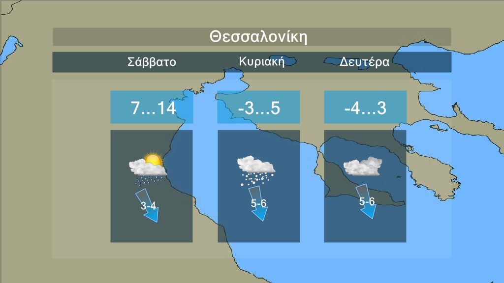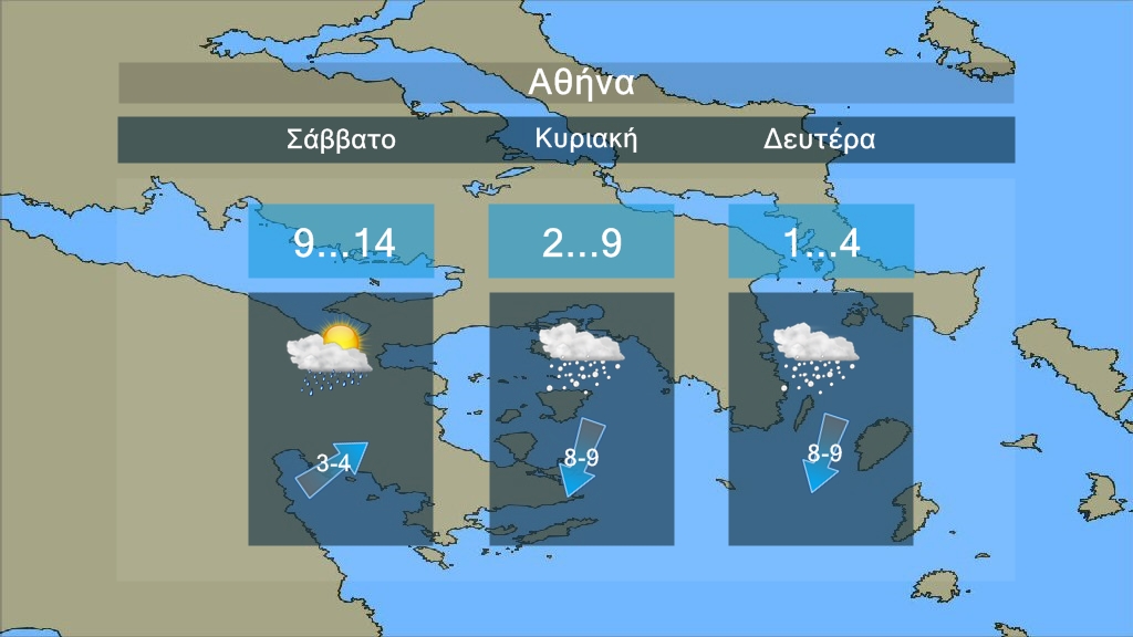 Επισημαίνουμε ότι θα έχουμε κατά τόπους πυκνές χιονοπτώσεις το Σάββατο αρχικά στη Μακεδονία και τη Θράκη, τα νησιά του βορείου Αιγαίου και γρήγορα στη Θεσσαλία, την ανατολική Στερεά (συμπεριλαμβανομένης της βορείας Αττικής), την Εύβοια, τη βόρεια και ανατολική Πελοπόννησο, ενώ τις βραδινές ώρες στα βόρεια θα εξασθενήσουν. Από τη Θεσσαλία και βορειότερα οι χιονοπτώσεις θα σημειωθούν και σε πεδινές περιοχές, ενώ ενδεικτικό υψόμετρο για την ανατολική Στερεά είναι τα 200-300 μέτρα και για την Πελοπόννησο τα 300-500 μέτρα.