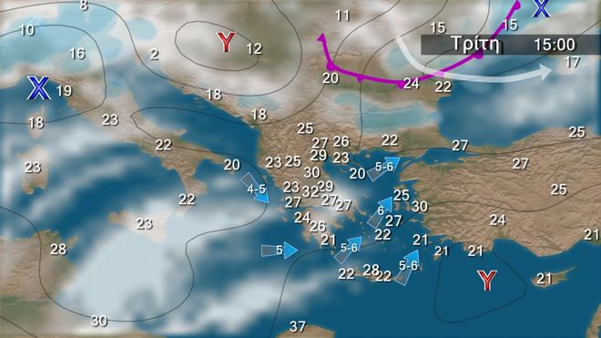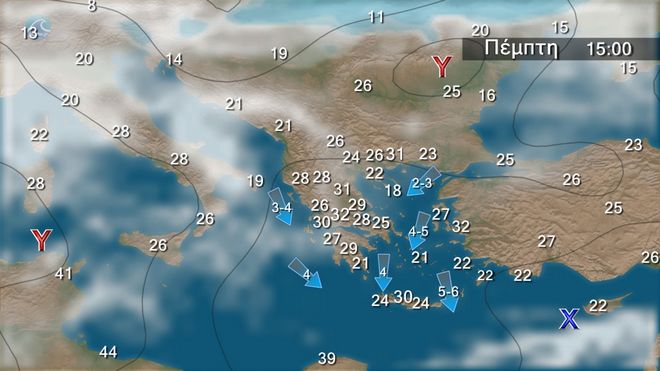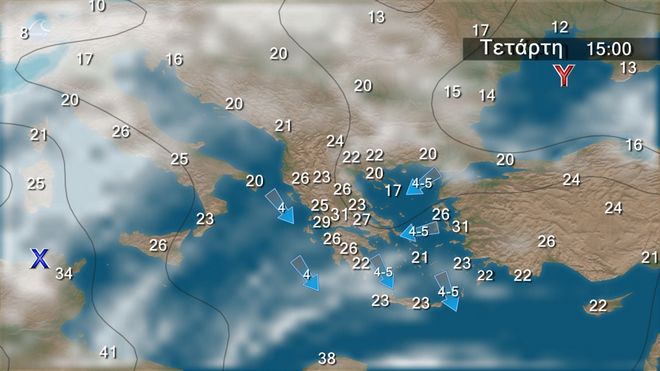 Γενικά αίθριος καιρός, με αραιές νεφώσεις κατά διαστήματα πιο πυκνές στα νότια. Τις απογευματινές ώρες στα βορειοανατολικά, θα αναπτυχθούν τοπικές νεφώσεις και υπάρχει πιθανότητα να σημειωθούν τοπικοί όμβροι στα ορεινά. Ευνοείται η μεταφορά σκόνης στα ανατολικά. Τοπικά περιορισμένη ορατότητα τις πρωινές και τις βραδινές ώρες κυρίως στα βόρεια Οι άνεμοι θα πνέουν από νότιες διευθύνσεις 4 με 6 και τοπικά στο Αιγαίο 7 μποφόρ. Βαθμιαία στα δυτικά θα εξασθενήσουν και μετά το μεσημέρι θα στραφούν σε βορειοδυτικούς. Η θερμοκρασία θα κυμανθεί σε υψηλά για την εποχή επίπεδα και αναμένεται να φτάσει στα ανατολικά ηπειρωτικά κατά τόπους τους 30 με 32 βαθμούς Κελσίου.
