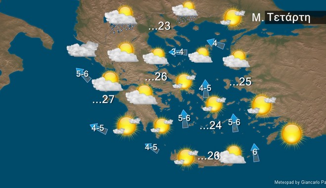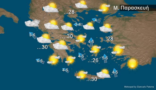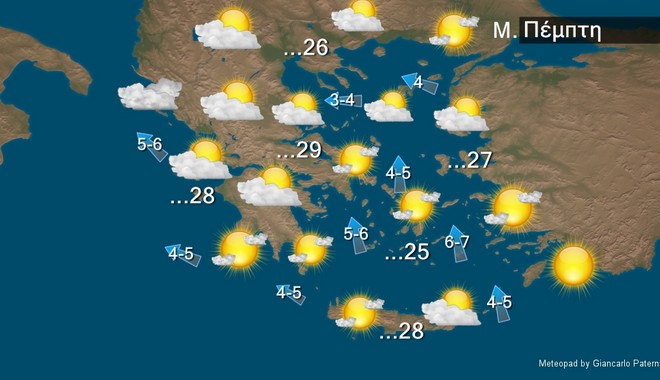 Γενικά αίθριος καιρός με αραιές νεφώσεις, οι οποίες κατά διαστήματα στα κεντρικά και νότια θα είναι πυκνότερες. Η ορατότητα τις πρωινές ώρες στα κεντρικά και βόρεια ηπειρωτικά θα είναι τοπικά περιορισμένη. Οι άνεμοι θα είναι στα δυτικά, κεντρικά και βόρεια μεταβλητοί 3 με 4 μποφόρ. Στις υπόλοιπες περιοχές θα πνέουν από νότιες διευθύνσεις 3 με 5 και στο νότιο Αιγαίο 6 με 7 μποφόρ με εξασθένηση από το μεσημέρι. Ευνοείται η μεταφορά αφρικανικής σκόνης στα κεντρικά και νότια. Η θερμοκρασία σε μικρή περαιτέρω άνοδο.