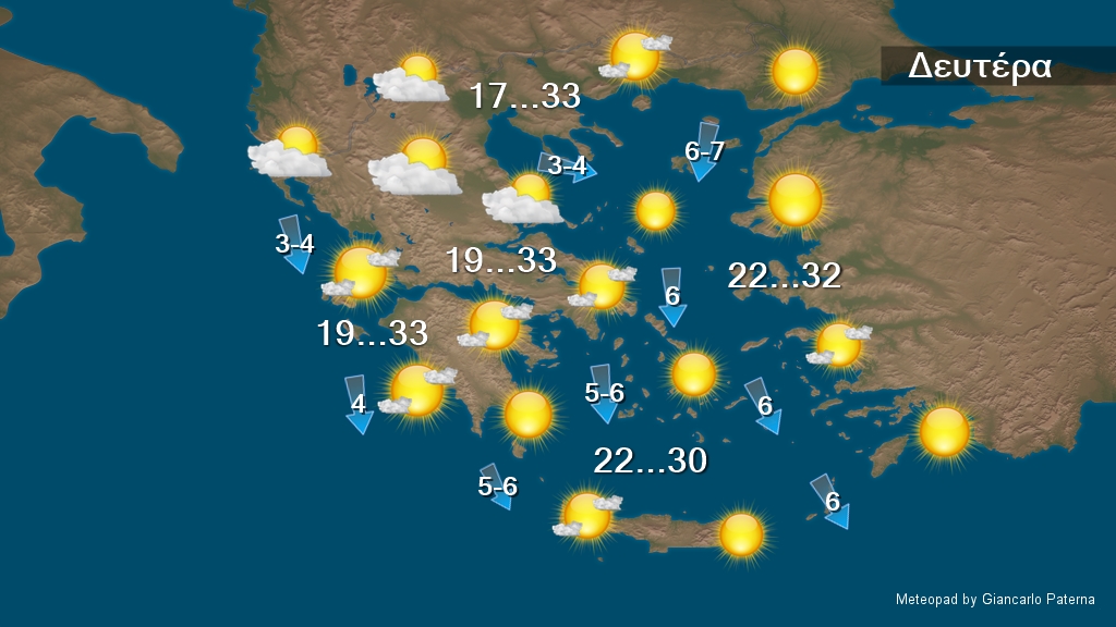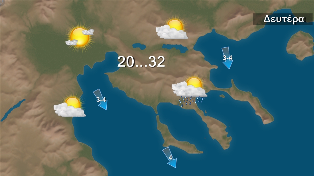 Σήμερα Δευτέρα στα ανατολικά ηπειρωτικά, κυρίως στην κεντρική Στερεά, στη νότια Πελοπόννησο, τις Σποράδες, την Εύβοια καθώς και στην Κρήτη προβλέπονται λίγες νεφώσεις παροδικά αυξημένες με τοπικές βροχές Από τις βραδινές ώρες στην Θεσσαλία θα εκδηλωθούν σποραδικές καταιγίδες. Στην υπόλοιπη χώρα σχεδόν αίθριος καιρός με λίγες νεφώσεις στη δυτική Ελλάδα, που τις μεσημβρινές και απογευματινές ώρες στα ηπειρωτικά θα αυξηθούν και θα σημειωθούν τοπικοί όμβροι , κυρίως στα ορεινά. Οι άνεμοι θα πνέουν από βόρειες διευθύνσεις στα δυτικά 3 με 5 μποφόρ, στα ανατολικά 4 με 6 και στο βορειοανατολικό Αιγαίο πρόσκαιρα τοπικά 7 μποφόρ. Η θερμοκρασία δεν θα σημειώσει αξιόλογη μεταβολή και θα φτάσει στα ηπειρωτικά τους 31 με 33 βαθμούς και στη νησιωτική χώρα τους 30 με 32 βαθμούς Κελσίου..