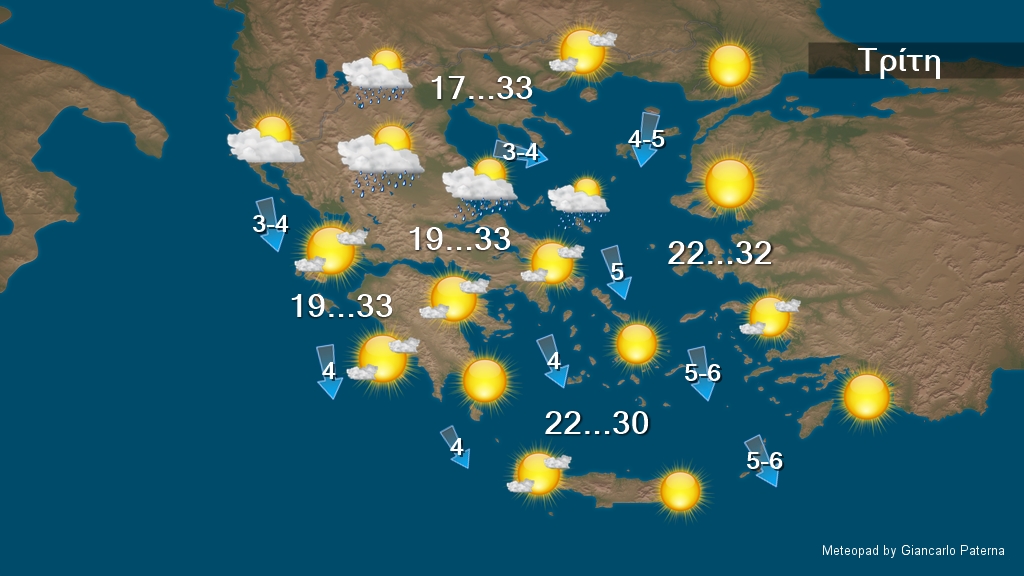 Γενικά αίθριος καιρός. Τοπικές νεφώσεις τις μεσημβρινές και απογευματινές ώρες στα ορεινά της ηπειρωτικής χώρας. Οι άνεμοι θα πνέουν από βόρειες διευθύνσεις 4 με 6 και τοπικά στο βόρειο και κεντρικό Αιγαίο έως 7 μποφόρ. Η θερμοκρασία θα σημειώσει μικρή περαιτέρω άνοδο στα δυτικά, βόρεια και τα νησιά του ανατολικού Αιγαίου.