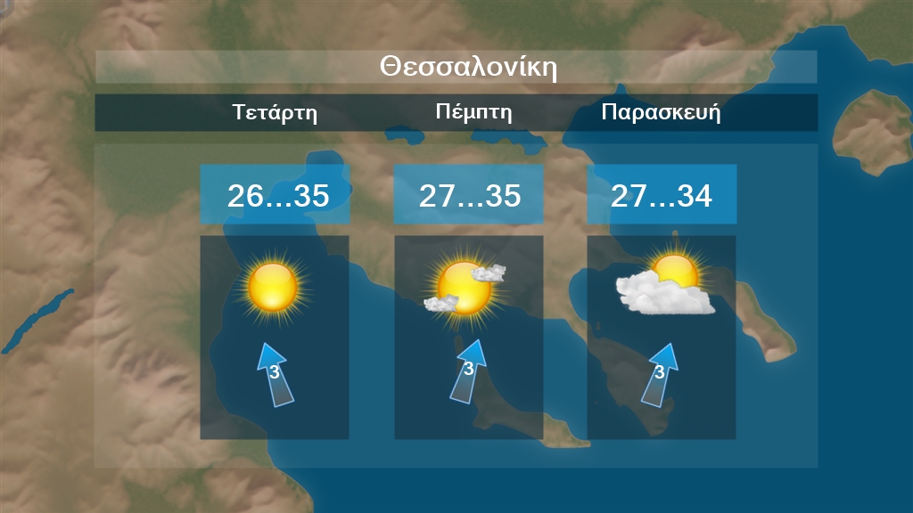 Στη Θεσσαλονίκη προβλέπονται λίγες τοπικές νεφώσεις . Η θερμοκρασία θα κυμαίνεται περί τους 34 με 35 βαθμούς Κελσίου.