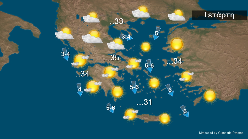Γενικά αίθριος καιρός, με τοπικές νεφώσεις τις μεσημβρινές και απογευματινές ώρες στα ηπειρωτικά, κυρίως στα ορεινά. Τοπικές νεφώσεις τις πρωινές ώρες στην βόρεια Εύβοια.Οι άνεμοι θα πνέουν από βόρειες διευθύνσεις 4 με 6 και πιθανώς τοπικά στο βορειοανατολικό Αιγαίο έως 7 μποφόρ. Η θερμοκρασία θα σημειώσει μικρή περαιτέρω άνοδο και θα κυμανθεί ως προς τις μέγιστες τιμές, στους 32 με 34 βαθμούς και τοπικά στα ηπειρωτικά τους 36 βαθμούς Κελσίου.
